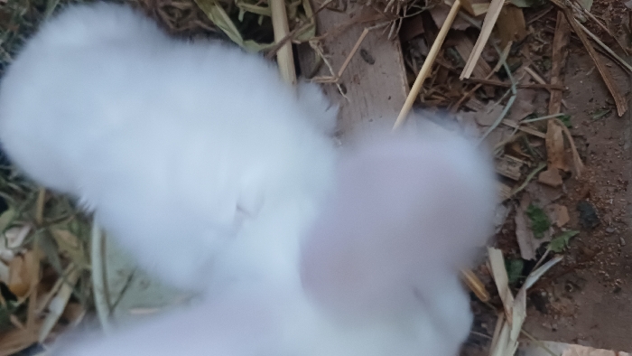 The scene depicts a small, fluffy white animal, likely a rabbit or chick, positioned in the foreground and mid-ground. Its soft, dense white fur or feathers cover the visible upper body, with a faint pinkish area discernible on what appears to be its face or snout. The animal rests on an irregular ground surface composed of dark brown soil and scattered organic debris, including dried straw, grass, leaves, and small wooden fragments. A light-colored, possibly ceramic or plastic, shallow bowl or container is partially visible in the upper-left quadrant, amidst the dried plant material. The environment suggests an outdoor or semi-enclosed natural setting. This scene is located in Kasansay, Uzbekistan.