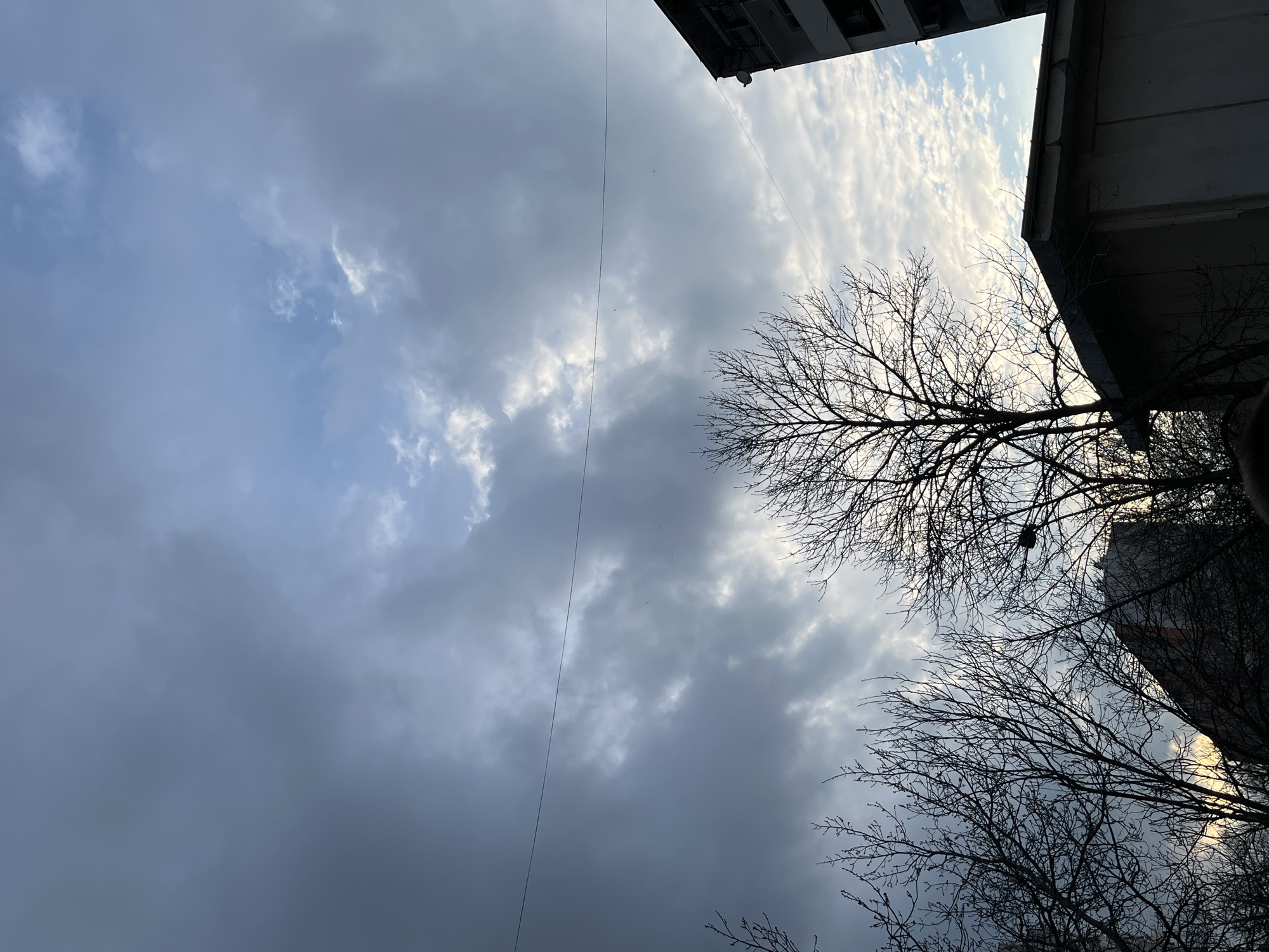 low-angle view of the sky partially obscured by buildings and tree branches. The sky is filled with clouds, with some patches of blue visible. There are bare tree branches silhouetted against the sky on the right side of the frame. Sections of two buildings are visible at the top of the image. A thin wire stretches diagonally across the sky. Given the prompt, it is likely that this image was taken in Dimitrovgrad, Bulgaria, although there is no other evidence to confirm that beyond the question context.