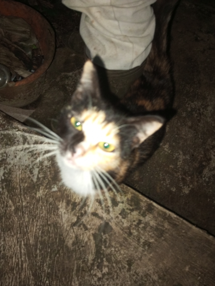 A calico cat, predominantly black, white, and orange-brown, with prominent green-yellow eyes and white whiskers, is captured looking directly upward towards the camera. Its head and upper body are in sharp focus, while its lower body and tail extend towards the upper right. The cat stands on a textured, dark brown and grey ground surface, possibly concrete or packed earth, with visible wear and unevenness. A human leg, encased in light-colored fabric (possibly trousers) and a dark shoe or boot, is partially visible in the upper right background, positioned behind the cat, suggesting the cat is interacting with or near a person. In the upper left background, an earthy-toned ceramic pot or planter containing debris, including what appears to be a clear glass bottle, is visible. The scene is dimly lit, indicative of low light conditions. The location is Ciherang, Indonesia.