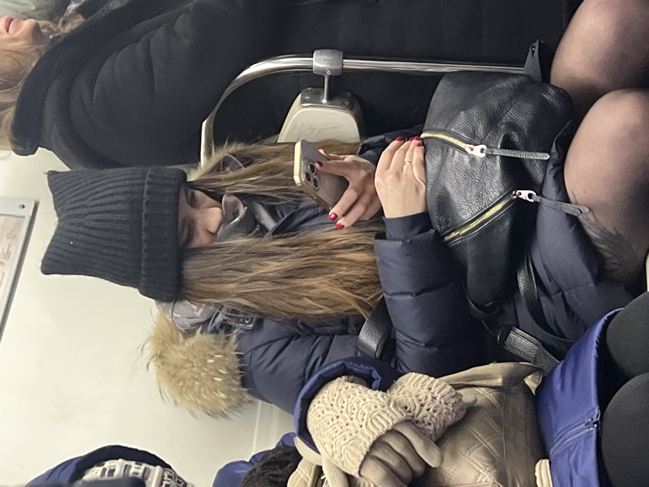 A woman wearing a black beanie and a blue puffer jacket is seated, looking at a smartphone. She has long brown hair and red nail polish. She is wearing knit mittens and a ring. A black leather bag is next to her, and part of another person is visible on top of her and the left of the frame. The photo appears to be taken on public transport.