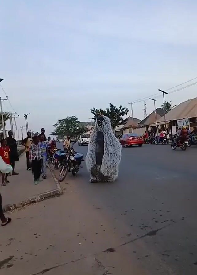 person in a large, grey and white furry costume standing in the middle of a street. The costume appears to resemble a yeti or bigfoot, with a dark face visible. Several people are gathered on the sidewalk, observing the costumed figure. Some are standing, while others are sitting on motorcycles parked along the curb. Motor vehicles, including cars and motorcycles, are driving on the street around the costumed person. The environment appears to be a residential or commercial area with buildings visible in the background. The sky is overcast, indicating it may be late afternoon or early evening. A woman crosses the street walking directly towards the costumed figure.
