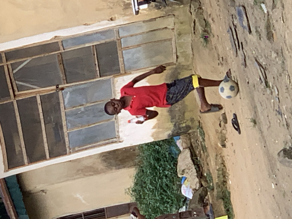 A young man in a red shirt and patterned shorts juggles a soccer ball with his foot. He's outdoors, holding a water bottle in his hand. The area appears to be residential. There is a building with multiple windows behind him and a dirt path or road with scattered debris to his right. He is wearing sandals. A small bush grows nearby.