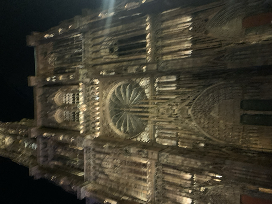 - "A low-angle, upward-looking night photograph depicts the illuminated western facade of Cathédrale Notre-Dame de Strasbourg in Strasbourg, France" by FM-hf0Wu2, licensed under CC BY 4.0