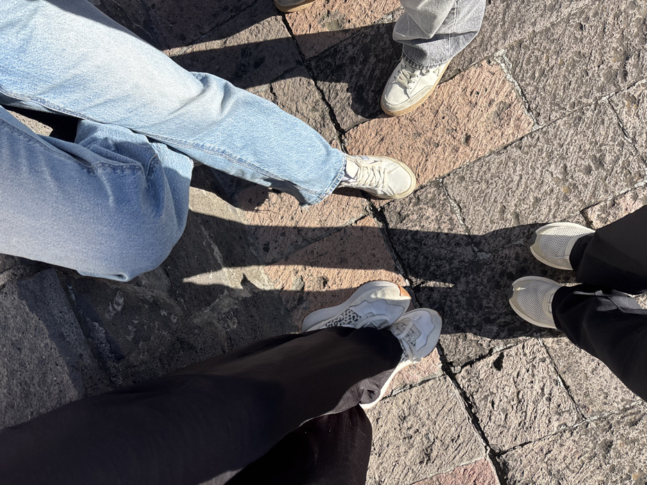 - "A top-down, outdoor image depicts the lower extremities of four individuals standing on a textured, stone-paved surface in Naucalpan de Juárez, Mexico" by FM-LuzOX2, licensed under CC BY 4.0