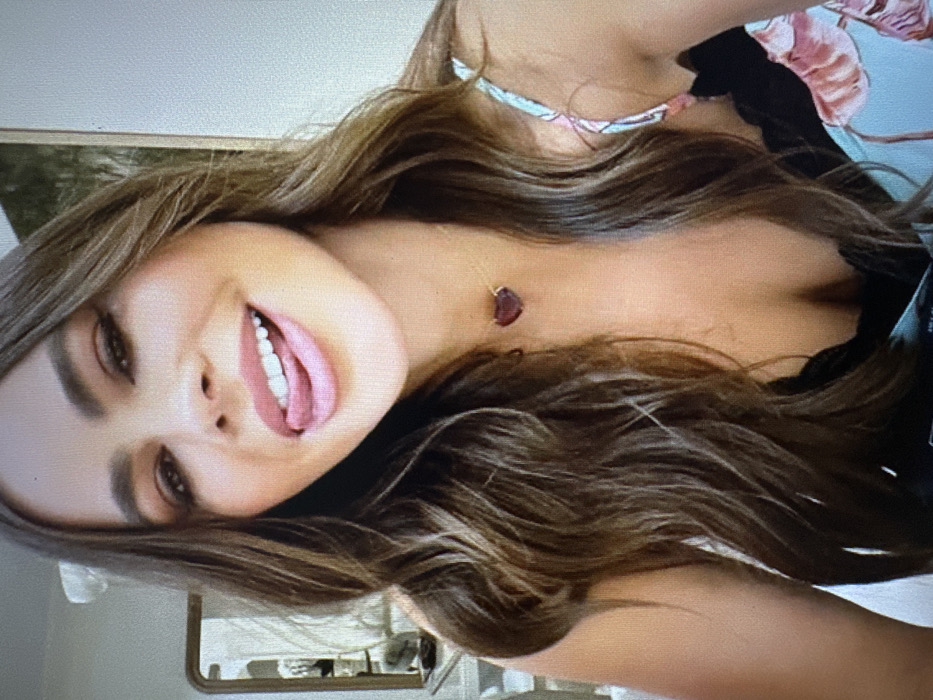 A young woman with long, wavy brown hair and fair skin is smiling and sticking her tongue out. She wears a floral top with black trim. A small, dark pendant hangs from a delicate chain around her neck. The background appears to be an indoor setting. The image is taken from a slightly downward angle, highlighting her facial features and neckline. The overall impression is casual and playful.