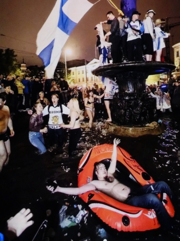 The image captures a crowded, chaotic nighttime scene around a large, multi-tiered urban fountain, located in Sysmä, Finland. A prominent Finnish national flag, white with a blue Nordic cross, is held aloft and visible in the upper left quadrant. The lower basin of the ornate fountain is filled with water, in which numerous individuals are standing. In the foreground to the right, a shirtless male with dark hair is supine in an orange inflatable boat, wearing blue jeans, with both arms raised; his left hand holds a dark, rectangular object. Floating debris, including empty beverage cans, is visible in the water around the boat. Towards the center-left in the water, a female wearing a white long-sleeved shirt with "SUOMI" and a bear emblem is standing waist-deep, looking upward with her mouth open. Adjacent to her on the right, another female with blonde hair is standing in the water, dressed in a black bikini top and black pants. To the left of the "SUOMI" shirt female, another female in a dark long-sleeved top and blue jeans is also standing in the water. Further left, a shirtless male in dark briefs is partially visible in the water. Multiple individuals are standing on the upper tiers of the dark, possibly bronze, fountain structure. These individuals are dressed in casual attire, some wearing white and blue sports jerseys, and one is holding a smaller flag. Buildings with illuminated windows and streetlights are visible in the background, indicating an urban setting under artificial lighting.