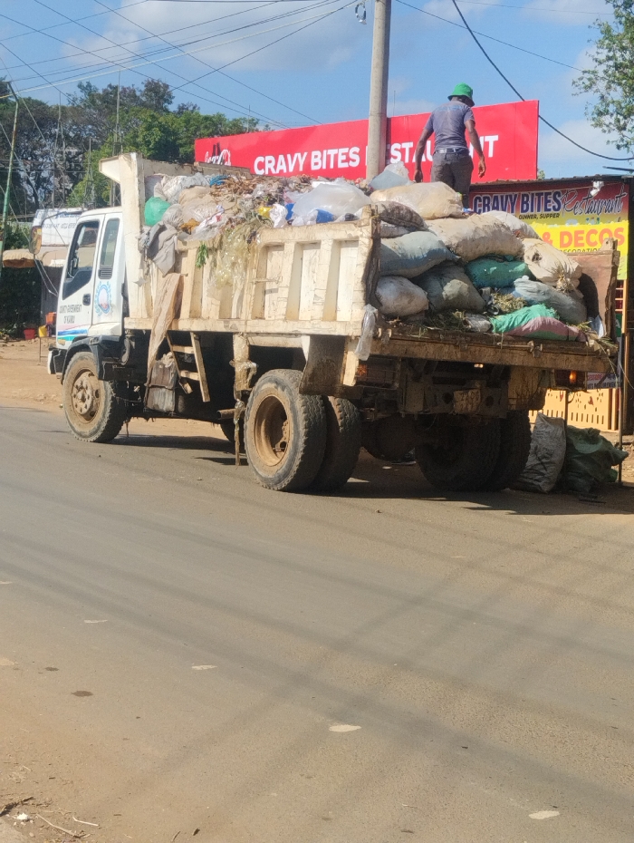 - "The scene depicts a dirty, white six-wheeled dump truck heavily loaded with a mixture of loose refuse and numerous large, stuffed bags, some appearing to contain organic or garden waste" by FM-ceYJN2, licensed under CC BY 4.0