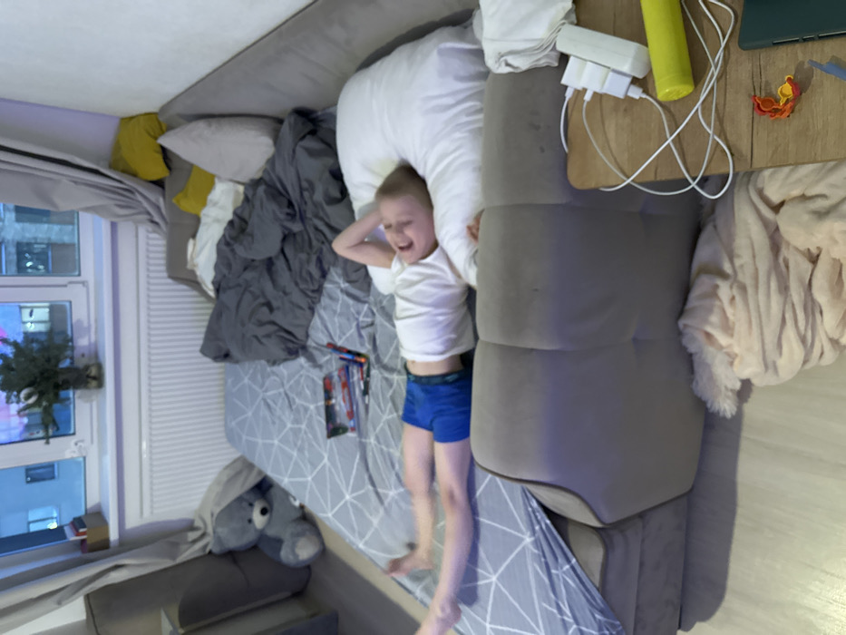 An interior scene in Murino, Russia, depicts a residential room, likely a living area or bedroom, at what appears to be evening or night due to the ambient lighting. A young child, appearing to be male, with light hair, is positioned centrally on their back on a light gray sofa-bed that is partially covered by a geometric patterned fitted sheet. The child wears a white t-shirt and blue shorts. Their head rests on a white pillow, and their mouth is open in a wide expression consistent with yelling or crying. Their left arm is bent with the hand near the head, and their legs are extended. The sofa-bed features a rumpled dark gray duvet. To the left of the child, on the patterned sheet, are several colorful markers or pens adjacent to a small book or magazine displaying an image of cars. A large gray teddy bear is seated against the wall to the left, partially obscured by a light gray curtain. In the background, a window displays a dark exterior with illuminated building windows. Below the window is a white radiator. On the windowsill, a potted plant with green foliage and red berries is visible. To the left of the window, a small stack of items rests on a narrow shelf. Purple ambient light emanates from above the window. To the right of the sofa-bed, a wooden bedside table holds multiple white charging adapters with tangled white cables, a yellow cylindrical object, an orange plastic object, and a dark green rectangular object (possibly a device). A light pink or beige crumpled blanket lies on the floor next to the table. The walls are light-colored, and the floor is a light wood or laminate. Two yellow decorative pillows are visible on a section of the sofa against the wall.