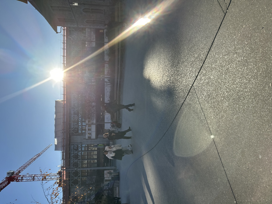 The image captures a sunlit outdoor plaza on the University of Zurich campus, Zurich, Switzerland. A strong lens flare emanating from the upper right quadrant of the frame traverses diagonally across the scene, indicating bright, direct sunlight. The ground is paved with light grey, granular material, marked by dark linear expansion joints, and features a prominent sun reflection in the lower-mid section. Four individuals are in the midground, walking across the plaza from left to right. On the left, two individuals are walking closely together: one wears a light-colored, possibly white or cream, puffy coat over dark clothing; the other wears dark clothing and carries a dark bag. Slightly to their right, a third individual, with visible long hair, is dressed in a dark coat and walks with their left arm slightly raised. Further right and ahead, a fourth individual, clad in dark attire including a cap and a backpack, walks away from the camera. In the background, two prominent structures define the environment. To the left and center, a large, multi-story building is under construction or renovation, characterized by a grey facade with multiple window openings, scaffolding, and white protective sheeting on its upper level. A tall red-and-white tower crane is positioned behind this building, extending upwards and to the left. To the right, an older, multi-story building constructed of dark grey stone blocks, featuring arched windows and a visible roof gutter, stands. Between the individuals and the background structures, bare trees with sparse leaves, public benches, and a low wall with visible graffiti are present. Long shadows from the subjects and unseen elements extend across the plaza towards the left, consistent with a low sun angle.
