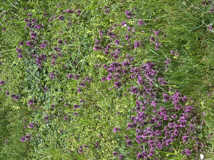 The image displays a dense patch of ground vegetation, characteristic of a natural or unmaintained area in the city of Berkovitsa, Bulgaria. The scene is dominated by a mixture of green grasses and numerous clusters of purple-flowered plants, consistent with Deadnettle (*Lamium* species). The purple flowers are tubular and arranged in whorls, presenting a vibrant contrast against the various shades of green foliage. Interspersed among the taller grass blades are patches of smaller, round-leaved plants and other low-lying ground cover in lighter green and yellowish-green hues. No human subjects, animals, or artificial objects are present. The lighting is natural, suggesting an outdoor environment during daylight hours. The perspective is a downward-facing shot, focusing entirely on the flora at ground level.