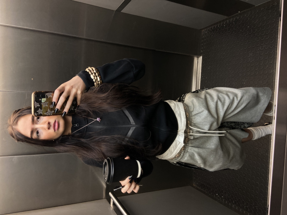 A young woman with long, dark hair is depicted taking a mirror selfie inside an elevator in the city of London, United Kingdom. She holds a black smartphone with a patterned case in her right hand, positioned to capture her reflection. Her left hand holds a black disposable coffee cup with a white band, and a dark-colored pen. She is wearing a dark, zipped athletic top with chevron accents, a white garment beneath it, and light grey sweatpants or long shorts secured by a gold chain belt. A dark, leopard-print fabric is partially visible beneath the grey bottoms. White socks or leg warmers and light-colored shoes are visible. Her nails are painted a dark color, and she wears a necklace with a purple pendant and multiple beaded bracelets on her right wrist. The elevator interior features brushed metallic walls and a dark, textured floor, with a metal handrail on the left.