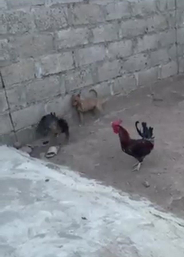 A very small, light-brown puppy cautiously approaches a chicken and a rooster near a concrete block wall. The puppy is small and appears wary, standing a few feet away from the chickens. The rooster stands tall, facing the puppy, while the chicken stays near a white sandal by the wall. The setting appears to be an outdoor area with a mix of concrete and dirt.