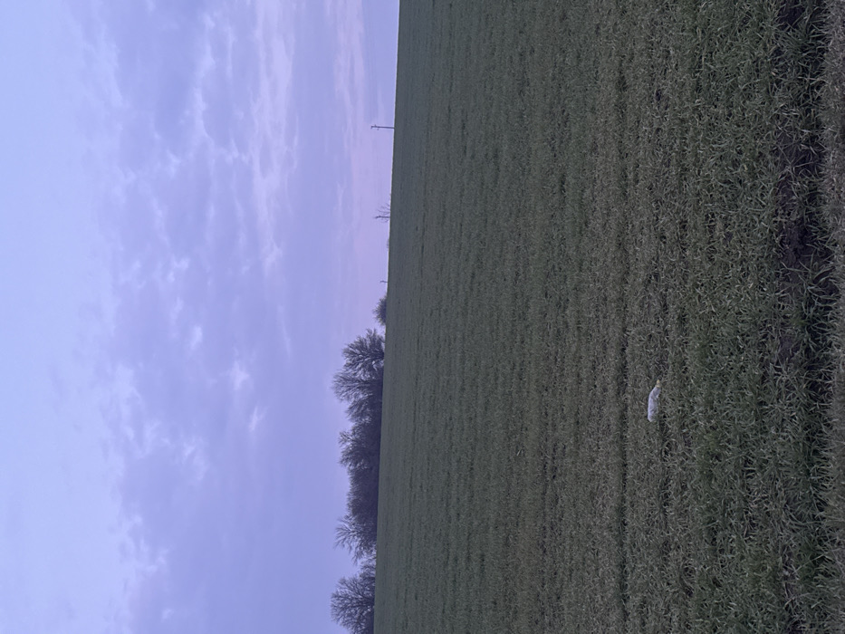 The scene depicts a rural landscape at twilight in Omarchevo, Bulgaria. The upper third of the image shows a muted lavender-grey sky with widespread, broken cloud formations. A dark horizon line runs across the middle of the image, representing a gentle rise of land. Along this horizon, a line of deciduous trees, mostly bare of foliage, is visible. To the far right on the horizon, a single utility pole with horizontal crossarms stands vertically. The lower two-thirds of the image consists of a cultivated field planted with a green, low-lying crop, displaying faint parallel rows consistent with agricultural practice. Approximately one-third of the way up from the bottom edge and slightly left of the vertical center, a single white, elongated object, consistent with a discarded plastic bottle, rests horizontally on the ground amidst the green crop. No individuals or active processes are observed within the frame.