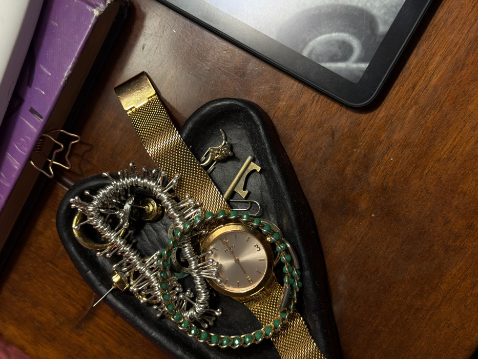 A black tray holds assorted jewelry and accessories. A gold mesh watch with a light face is the focal point, surrounded by a silver, wire-like bracelet and a green beaded chain. A gold-colored key paperclip, a bull-shaped pin, and a gold hairclip are also in the tray. A purple book is visible on the left, and the corner of a tablet is in the upper right of the frame. The tray sits on a wood surface.