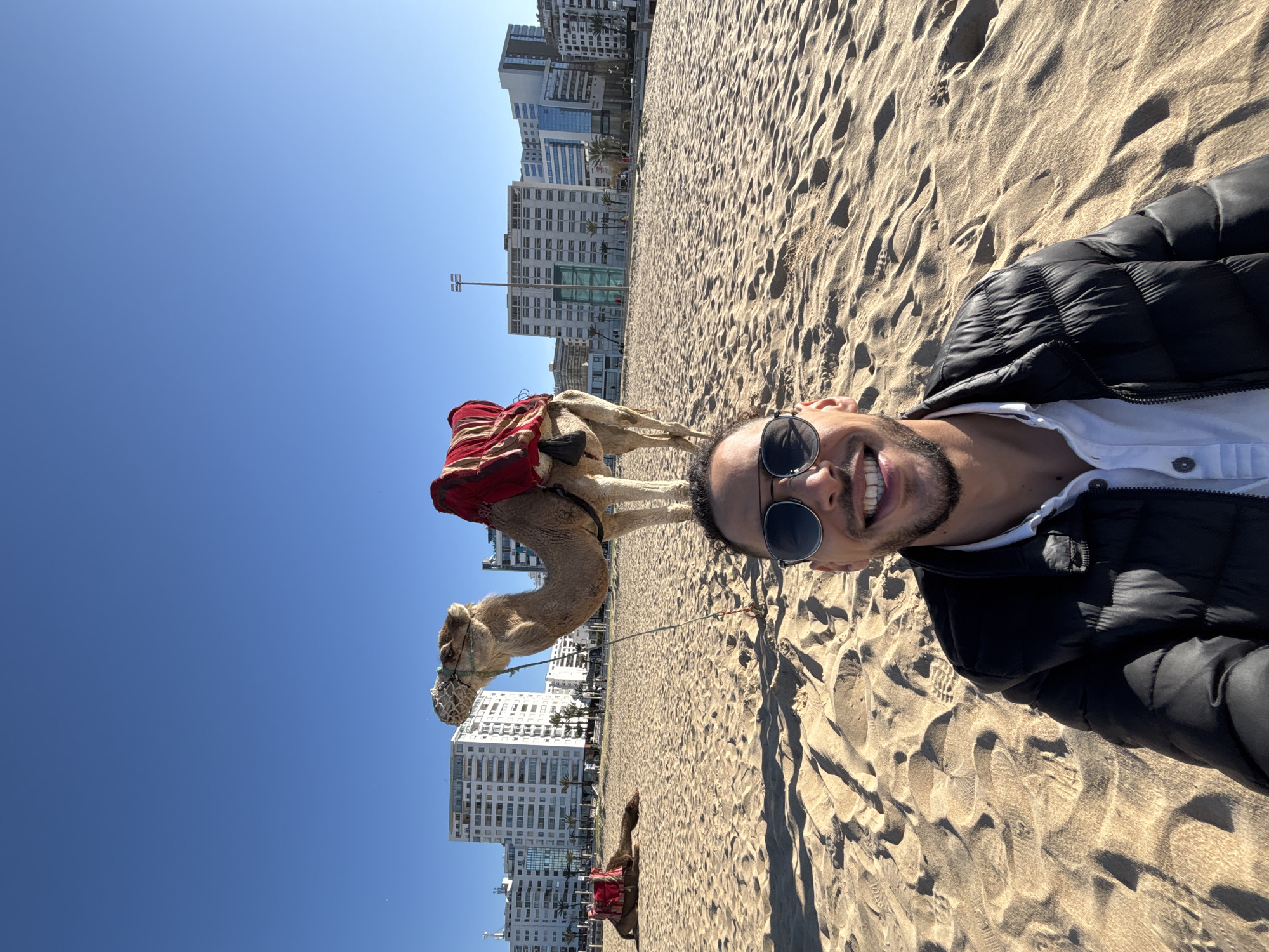 The image is a selfie of a smiling man with dark hair, sunglasses, and a black jacket over a white shirt, taken on a sandy beach. In the background, there's a camel adorned with a red blanket on its back. Further in the background, there are several buildings. The location is Tanger (Tangier), Morocco. The man is standing on the sand, possibly interacting with the camel and posing for the photo. The environment is sunny with a clear blue sky.