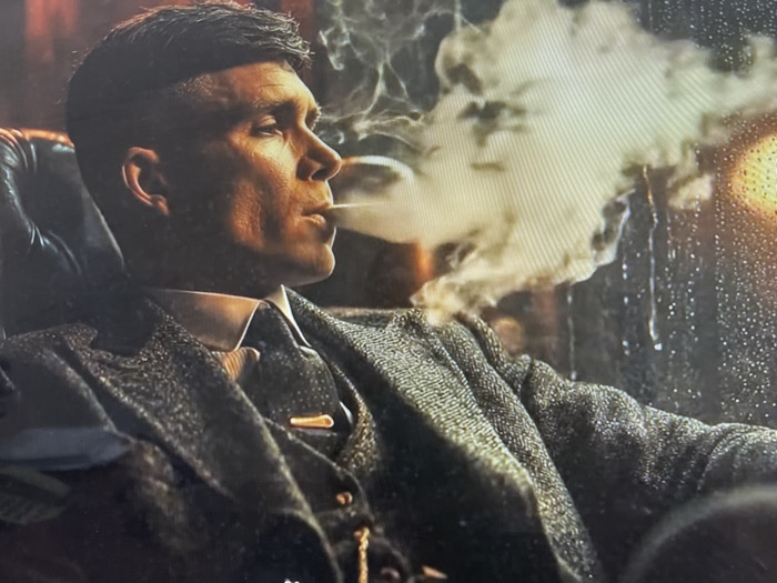 The scene depicts a single adult male, viewed in profile, seated in a dark leather armchair within an interior setting in Namangan City, Uzbekistan. The man, with short dark hair styled in an undercut, wears a dark, patterned three-piece suit consisting of a jacket, waistcoat, white collared shirt, and a dark tie secured by a gold-colored tie bar. A gold watch chain is partially visible on his waistcoat. He holds a lit cigarette between his lips, from which a substantial plume of white smoke billows upwards and to the right. His expression is serious, and his gaze is directed forward and slightly upward. The background is dimly lit, with a window pane visible on the right, covered in numerous water droplets, suggesting precipitation. Through the obscured window, a blurred warm orange light source is apparent.