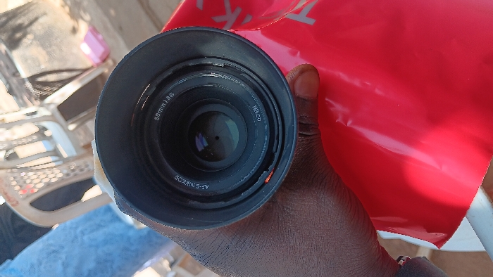 Kuru, Nigeria: A dark-skinned hand firmly grasps a black Nikon AF-S NIKKOR 50mm 1.8G camera lens, which is fitted with a black lens hood. The lens barrel shows minor surface damage or wear. The hand is positioned above a bright red, reflective plastic or vinyl material. In the blurred background, a person's leg in blue jeans is partially visible on the left. Several white plastic chairs with a distinctive honeycomb pattern on their backrests are discernible further back, resting on light-colored ground. Indistinct shapes, including a pink object and a dark object, are present in the distant, out-of-focus background. The scene suggests an outdoor or semi-outdoor setting.