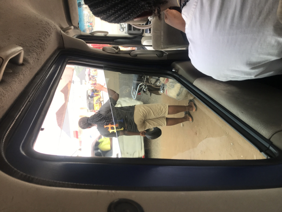 The image depicts a scene in Ogbunike, Nigeria, viewed from inside a vehicle looking out a side window