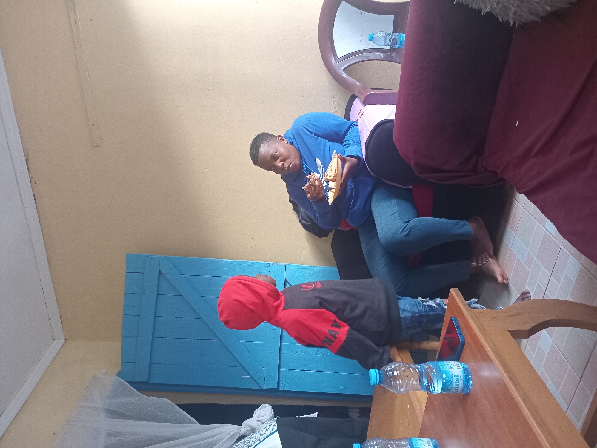 The image depicts two individuals indoors. One person, wearing a blue shirt and jeans, is seated and eating. Another person, wearing a black and red hooded sweatshirt and jeans, is sitting on a chair near a small wooden table. The table has two water bottles and a cell phone on it. A blue wooden door is visible in the background, adjacent to the wall. The room appears to be in a home in Webuye, Kenya.