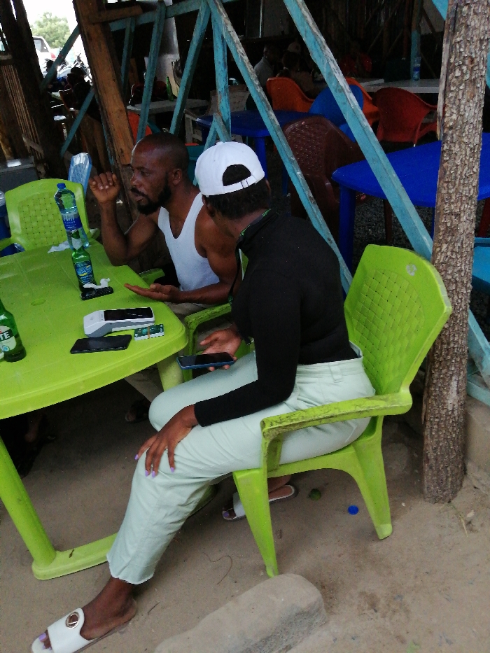 An outdoor scene in Machinjioni, Tanzania, features a man and a woman seated at a bright green plastic table. The man, positioned on the left, is a bald or short-haired individual with a beard, wearing a white tank top. His right arm is bent, with his fist resting on his chin, and his left hand is open, palm facing upwards on the table. The woman, on the right, is seen from behind, wearing a black long-sleeved top, light green trousers, and a white baseball cap worn backward. She holds a dark-colored smartphone in her left hand, which rests on her lap, while her right hand is on her right knee. She wears white open-toed sandals. On the green table, a clear plastic water bottle with a blue cap is stacked atop a green glass bottle. To the left of this stack, another green glass bottle is visible. Three electronic devices are on the table: a black smartphone, a grey mobile point-of-sale terminal, and a smaller black device to its right. The man and woman are seated on matching bright green plastic chairs. The environment includes a sandy or dirt ground. A light blue bottle cap and a small green object are visible on the ground near the woman's chair. Structural elements in the background consist of wooden posts and a light blue painted wooden lattice-like framework. Other plastic tables and chairs, in blue, red, and brown, are visible in the background, indicating additional seating. Partially visible individuals are present at these background tables. A tree trunk or wooden post stands on the far right.