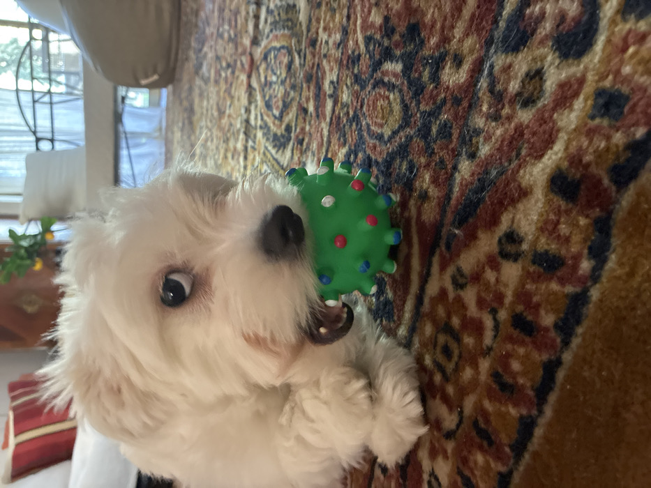 An indoor scene in Vouliagmeni Municipal Unit, Greece, depicts a white-furred dog, possibly a Maltese, lying on an ornate rug. The dog's left side faces the viewer, its body resting on its front paws. Its dark eyes are visible, looking slightly upward and to the right of the frame. A dark nose and mouth are prominent, with the mouth partially open, revealing canine teeth. A faint reddish mark is visible on the dog's left cheek. The dog is actively biting or holding a bright green, spherical rubber toy with numerous small, multi-colored (red, blue, white) spiked protrusions. The rug beneath the dog features a traditional pattern in shades of maroon, dark blue, gold, and brown. In the out-of-focus background, a light-colored sofa with red and white striped pillows is partially visible on the left, while a dark, soft beanbag chair is on the right. Further back, natural light enters through what appears to be a window or doorway, revealing indistinct furnishings and a plant with orange elements.