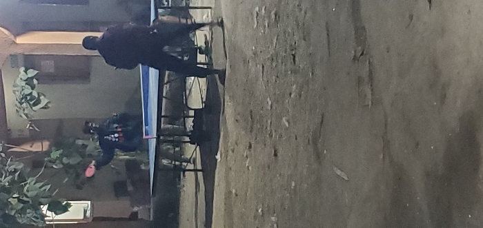 Two people play table tennis outdoors. One person stands on the left with a paddle raised, ready to hit. The other person on the right leans over the table. A building and plants are visible in the background. The foreground shows a rough, uneven surface, possibly a yard or pavement. The overall lighting is dim, creating shadows and obscuring details.