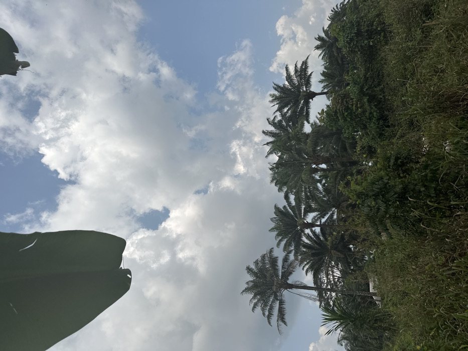 The image captures a tropical landscape in Afaha Ibesikpo, Nigeria, under a partly cloudy sky