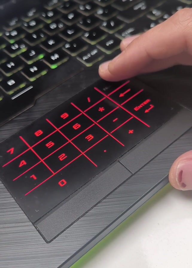 close-up of the touchpad of a black laptop. A finger taps the touchpad, which initially displays a red, illuminated number pad. After being tapped, the number pad disappears, leaving the touchpad a solid black color. The laptop keyboard above the touchpad has customizable backlighting, which shifts from orange/yellow to green to purple during the clip. The laptop sits on a white surface.