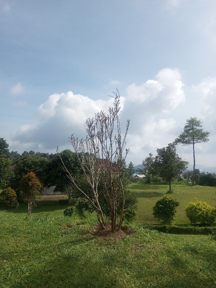 The image depicts an outdoor landscape in Đăk Pxi, Vietnam, characterized by green terrain under a partly cloudy blue sky. In the foreground, a leafless deciduous tree with multiple slender, dark-brown branches stands centrally, its base surrounded by a ring of darker soil. The ground is covered in green grass, with several smaller, dense green shrubs visible to the left and right of the central tree. The midground features a sloping grassy area leading to a mix of deciduous and coniferous trees. To the left, a dense cluster of trees, one displaying reddish-brown foliage, partially obscures a structure with a reddish-brown roof and light-colored walls. Towards the right, a tall, slender coniferous tree stands prominently against the sky, with additional scattered green trees and bushes below it. In the distant midground, a light-colored building with a blue roof is visible. The background reveals undulating hills beneath large, white cumulus clouds. No individuals, animals, or observable actions are present within the scene.