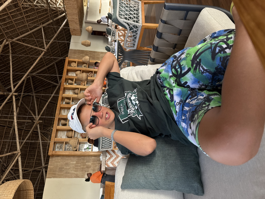 A young male is centrally seated on a light-colored outdoor sofa with a dark green throw pillow in what appears to be a resort lounge or restaurant in Zanzibar, Tanzania