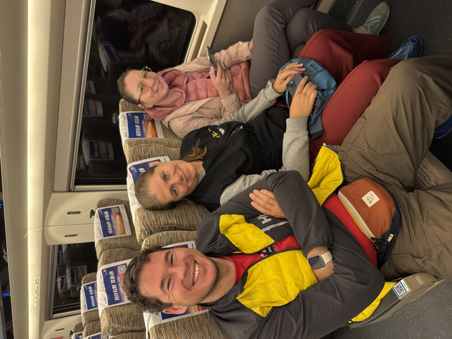 Within the interior of a high-speed train carriage in Yongding District, China, three individuals are seated side-by-side, facing the camera