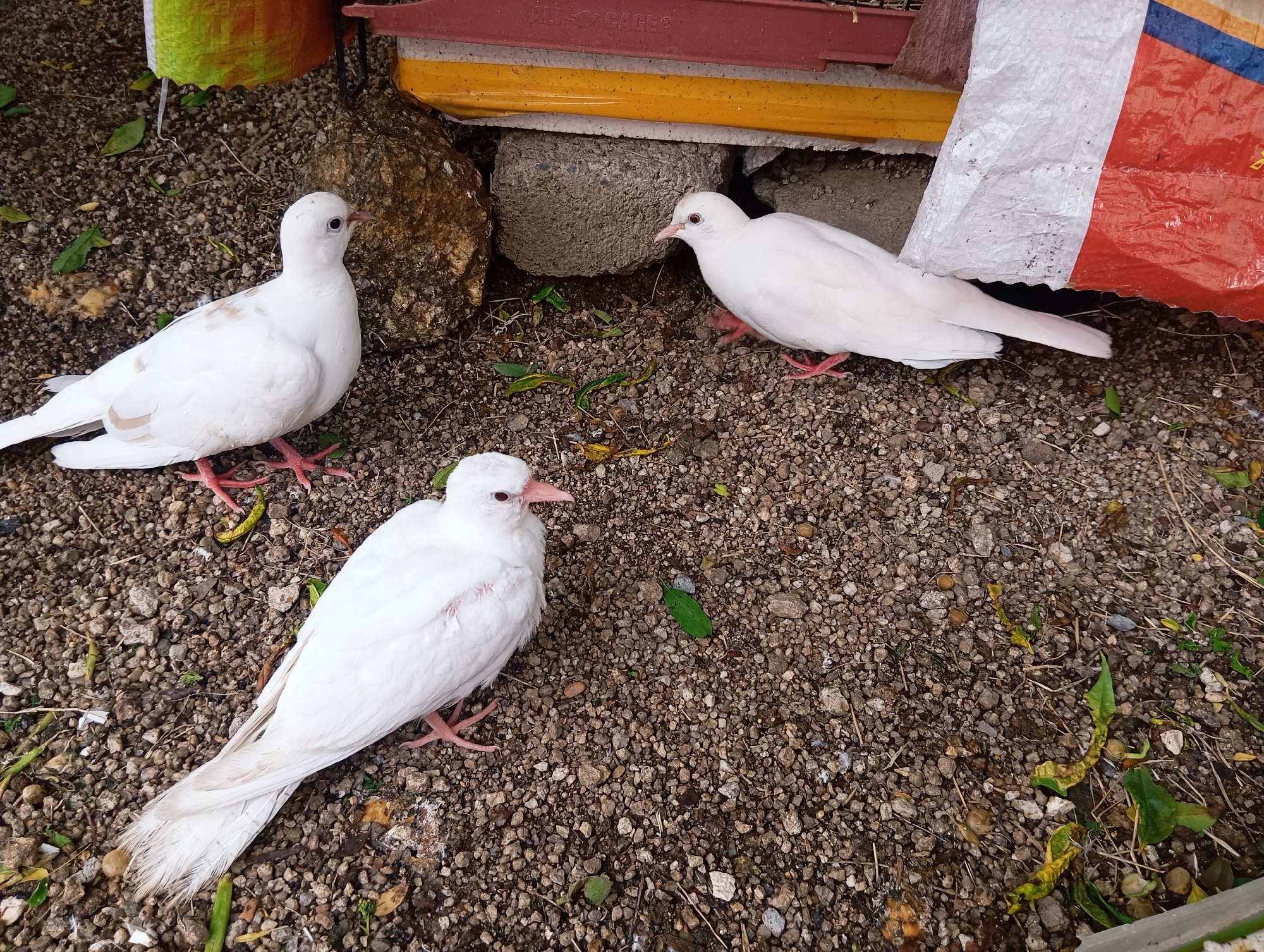 Three white doves stand on a gravelly surface. In the background are concrete blocks and a partly visible white-red-yellow plastic bag. The location is suspected to be Lassan, Pakistan.