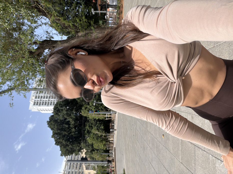 The image depicts a female individual taking a selfie outdoors in an urban environment identified as Al Jizah, Jordan, under clear, sunny conditions. **People:** One female subject occupies the foreground, positioned to the right of the frame, capturing a selfie. She has long, dark brown hair, partially pulled back, with some strands framing her face. She wears dark-tinted, oval-shaped sunglasses and a white earbud in her right ear. Her expression features puckered lips. **Subjects/Objects:** The female wears a light beige/tan long-sleeved crop top with a twisted knot design at the front, exposing her midriff. She is also wearing dark brown bottoms. A delicate necklace with small charms is visible around her neck. **Actions/Interactions:** The subject is actively taking a selfie, holding the camera with her left hand, which is not fully visible. She is directly facing and posing for the camera. **Environment:** The background reveals a bustling urban landscape. The ground beneath the subject is paved with light-colored rectangular tiles. Behind her, a street or pedestrian area is visible, bordered by numerous green trees and foliage. In the mid-ground, a blue sign with white text and a possible symbol is attached to a pole. Further back, several multi-story buildings are present. A prominent modern white high-rise building with multiple windows or balconies stands against a clear blue sky in the center-right. Other buildings, including one with darker facades on the far left, are also discernible. Sunlight illuminates the scene, casting shadows, and a green traffic light signal is visible on the left side of the street.
