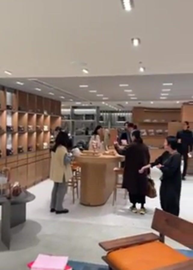 The interior of a luxury retail store is shown. Patrons browse items on shelves and tables. Several store employees dressed in black interact with customers. The interior is well-lit, with wood and soft-colored furnishings. There is a chair with orange upholstery. Clothes hang on racks, and there are shoes on display.