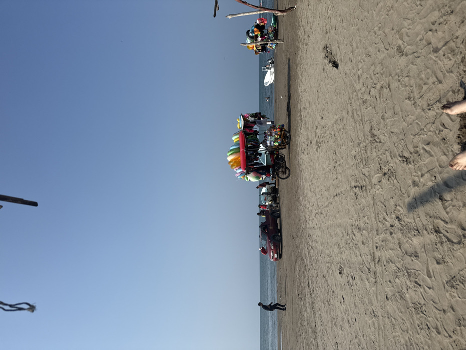The image displays a daytime beach scene located in Antón Lizardo, Mexico. The sky is clear and cloudless, exhibiting a light blue hue. In the immediate foreground, two bare human feet are visible, positioned on light brown sand marked with numerous footprints. In the mid-ground, a sandy beach extends towards the ocean. A lone individual, dressed in dark clothing, is observed walking leftward across the sand. Closer to the water's edge, a red pickup truck is parked on the sand. Multiple people are gathered around the truck and along the waterline. To the right of the truck, a mobile vendor cart is visible, constructed from a motorcycle with an attached wheeled trailer. This cart features a red canopy and is laden with numerous colorful inflatable rings on top, with various garments and bottled items hanging below. Further to the right, another vendor stand, also displaying colorful merchandise, is positioned closer to the ocean. In the background, the calm blue ocean meets the horizon. A small white boat with an outboard motor is present in the water, to the right. At least one human figure is discernible wading or swimming in the ocean. Dark, linear elements and a rope-like object are partially visible in the upper corners of the frame, indicating overhead structures.