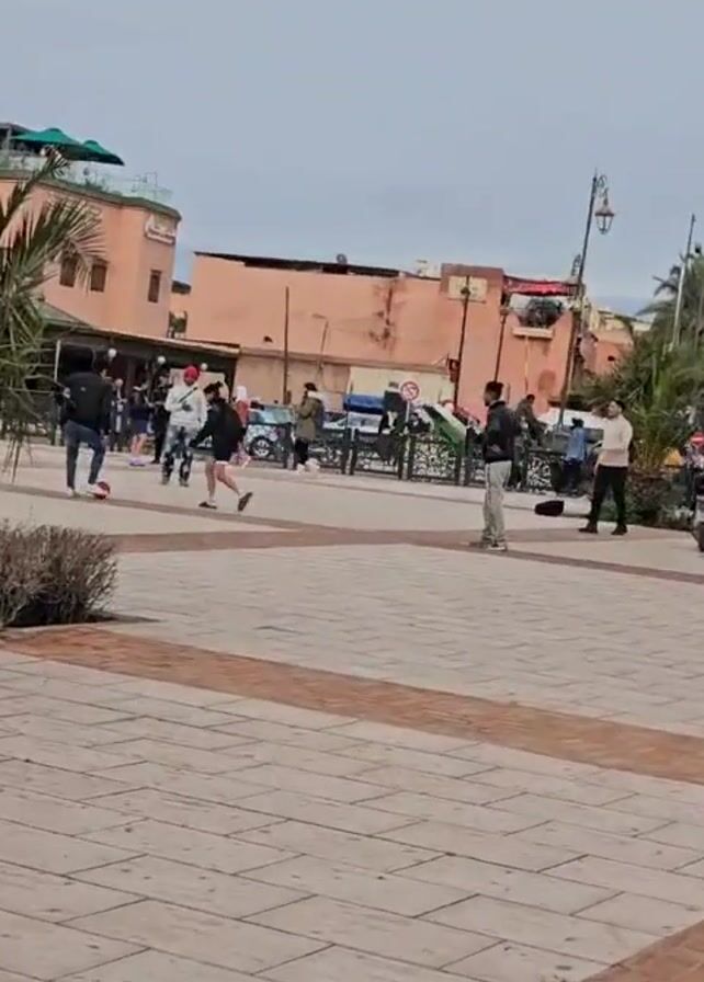 The scene depicts a square in a city, likely in Morocco, with several individuals playing with a soccer ball