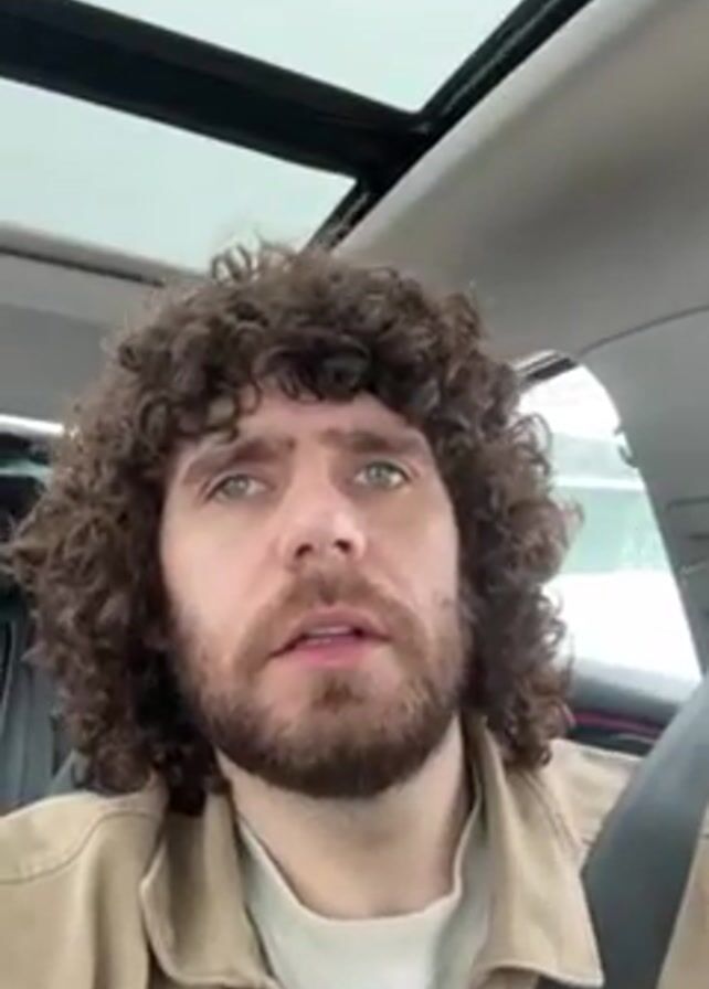 A close-up, eye-level shot shows a person with curly brown hair and a beard sitting in a car