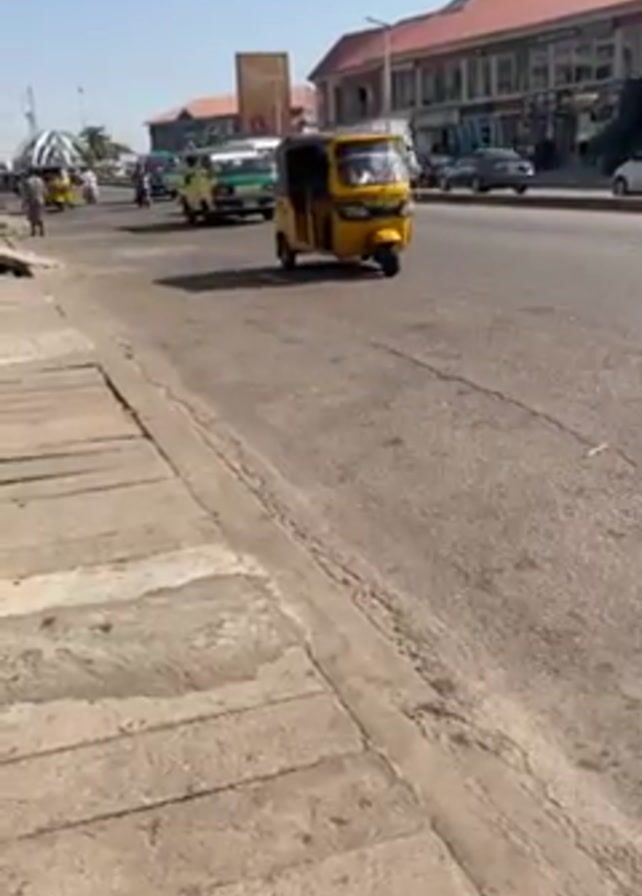 street scene during the day. The camera is positioned on the sidewalk, looking out onto the road. There are vehicles moving along the road including yellow auto rickshaws, cars, and motorcycles. There is a sidewalk made of concrete slabs to the left of the road. There is a building with shops across the road. The sky is clear and blue. The scene looks like it is taking place in a busy, urban area.