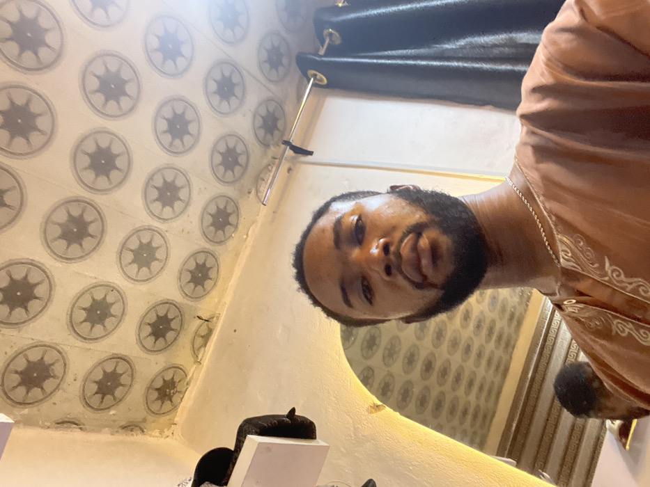 The provided image is stated to be located in the city of Idah, Nigeria, and depicts an indoor scene. A male individual, appearing to be in his 20s or 30s with a dark complexion, short dark hair, and a full dark beard, is positioned centrally, looking directly at the camera with a neutral expression. He wears a light brown tunic-style shirt with white or light-colored embroidery around the neckline and a silver-colored chain necklace. To the left of the individual, an arched mirror with a visible illuminated frame reflects a partial view of his head and shoulders, as well as a section of the room's ceiling. The ceiling is light-colored, possibly white or cream, and features a repetitive pattern of dark circular designs, each containing a multi-pointed starburst or gear-like motif. Evidence of wear, discoloration, or patching is visible on the ceiling, particularly near the wall junctions. The walls are also light-colored. On the far right side of the image, dark, possibly black or dark blue, curtains are visible, suspended from a silver-colored curtain rod. In the upper left background, a dark, partially obscured object rests atop a white, rectangular fixture.