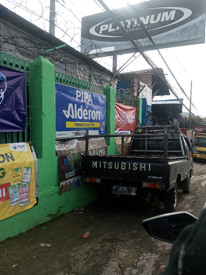 black Mitsubishi Colt pickup truck parked on a street next to a green wall with advertisements. The ads include "PIPA Alderon" for premium UPVC pipes, "Nippon Paint," and a yellow poster. Above the wall, a "Platinum Ramis" sign is visible. The license plate of the truck reads "F 8296 YK." Razor wire is strung above the fence. The image is taken from the perspective of a driver on a motorcycle. A yellow truck is visible in the background.