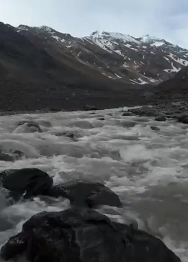 fast-flowing river surrounded by mountains. The river water is turbulent and mostly white, flowing over dark rocks. The mountains in the background are rugged, with patches of snow on their peaks and dark grey or brown slopes. The sky is overcast.