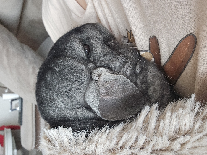 - "A dark grey chinchilla is depicted lying on a light-colored garment worn by an unseen individual, in an indoor setting within the city of Shumen, Bulgaria" by FM-EssVw1, licensed under CC BY 4.0