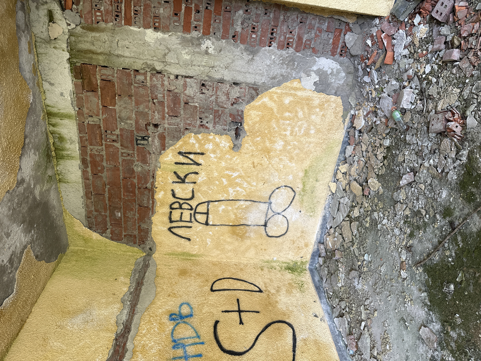 The image depicts a section of a derelict building located in Reselets, Bulgaria. The interior wall is comprised of exposed red brick, a layer of grey concrete, and a damaged yellow stucco finish. Graffiti is present on the yellow stucco, including the Bulgarian word "Левски" (Levski) above a drawing of male genitalia. Additional graffiti consisting of "HDB" and a symbol resembling "S + D" is also visible. Debris, including broken brick and stone, is scattered on the floor next to the wall. A discarded plastic bottle is visible among the debris. The overall environment is one of decay and neglect.
