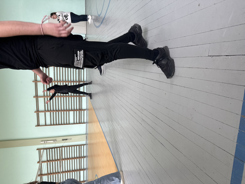 An indoor gymnasium in Beloslav, Bulgaria, features light green walls and a gray wooden floor with a blue court line in the foreground. A section of polished lighter wood flooring is visible on the far left, bordering a volleyball net. Wooden wall bars are mounted along the far wall. Four individuals are present. In the immediate foreground, a person, likely male, is partially visible from the chest down, wearing black cargo sweatpants with white text on a pocket, a black t-shirt, and black New Balance 327 sneakers. A pink and white braided bracelet is on their right wrist. In the mid-ground, slightly left of center, a male figure in all black attire stands with both arms raised above his head, palms open, appearing to be actively gesturing. To the far right, another person, a female, stands smiling, wearing a white long-sleeved top with a black design, blue jeans, and white shoes. She holds a red and white braided object in her raised right hand. A fourth individual is partially visible on the far left, standing on the polished wood floor, wearing blue jeans and light-colored shoes. The scene suggests a sports or activity session.