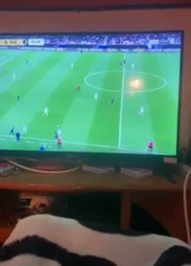 TV screen displaying a soccer match with a score of 0-0 between PSG and FLA. The game clock shows 31:49. The scene is a field with multiple players wearing white and blue uniforms. The players are moving the ball around the field. In front of the television is a wooden table with various objects on it, including a cable, a pack of playing cards, and other items. A person is shown sitting in front of the table under a zebra-patterned blanket, partially obscured from view. The room has a dark red ceiling.
