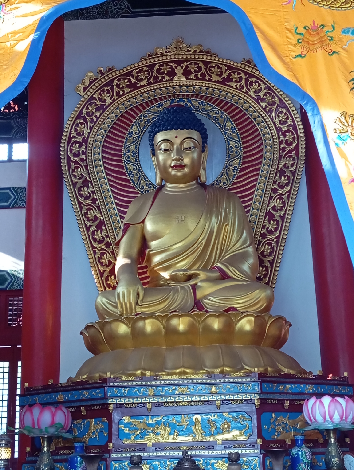 This image captures a large, seated golden Buddha statue positioned centrally within a temple in the city of Oshojetban, Nepal. The primary subject is a Buddha figure, rendered in gold, with a serene facial expression and tight blue curls on its head. A swastika symbol (Manji) is visible on its chest, and its golden robes are draped over the left shoulder, revealing a hint of red trim. The Buddha is seated in the Dhyana Mudra (meditation gesture), with hands resting in its lap, and is positioned on a prominent golden lotus throne. Behind the Buddha, an elaborate circular aureole is fixed against a light-colored wall. This aureole is rich in detail, featuring intricate gold and red patterns including floral motifs and concentric rings. The golden lotus throne rests on a multi-tiered, intricately carved pedestal. This pedestal is predominantly blue and dark-toned, decorated with gold relief carvings that depict various figures, floral designs, and geometric patterns. The immediate environment includes two stout red pillars flanking the central statue, suggesting an indoor temple setting. Above, portions of a dark, ornate ceiling structure are visible, along with architectural elements in red and blue. Yellow fabric banners, edged with blue and adorned with embroidered designs (possibly mythical creatures and foliage), hang from the upper corners of the scene, partially obscuring the top-left and top-right. On the lower front platform of the pedestal, several objects are arranged: two illuminated pink and white lotus-shaped lamps or offerings, alongside decorative blue and white vases and other dark metallic items. Ambient light, likely from external windows, illuminates the scene from the left, indicated by a window grid pattern partially visible behind the left red pillar. No individuals are present, and no actions or interactions are depicted.