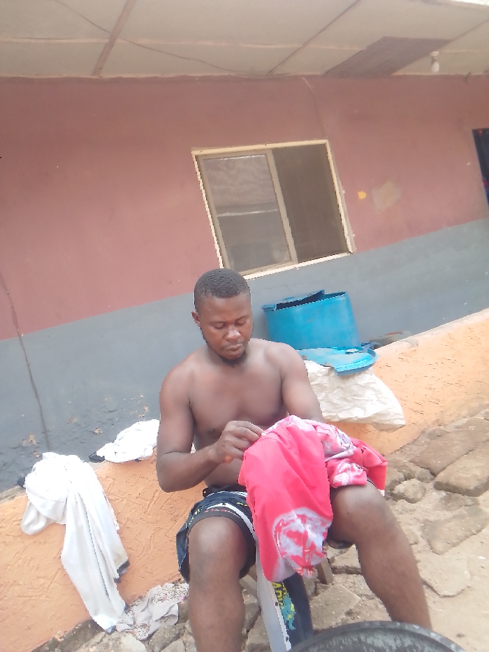 A shirtless male with short dark hair and a beard is seated outdoors in Owerri, Nigeria, wearing dark patterned shorts