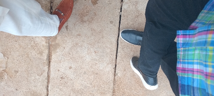 A low-angle shot captures the lower portions of two individuals standing on a concrete surface divided by cracks. On the left, a person wears white trousers and a brown loafer. The right figure is dressed in black jeans and black shoes with white soles. A portion of a colorful plaid shirt is visible next to the right figure's leg. The composition suggests a casual and perhaps informal setting.