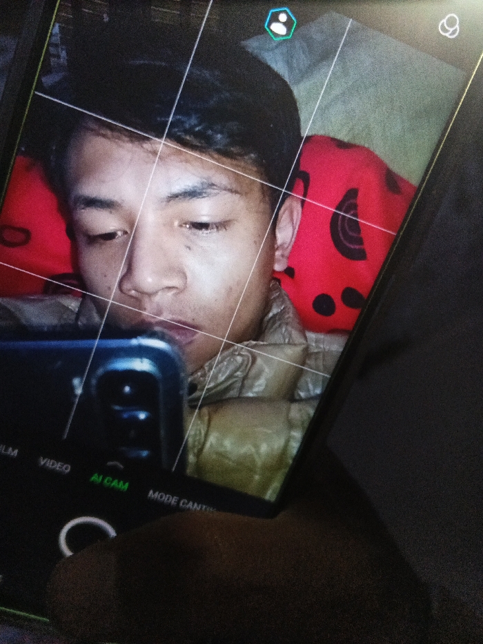 A person captures their face on a smartphone. Grid lines are visible on the screen, framing the individual's face. They are resting against a red pillow with dark patterns. A second smartphone is positioned in front, slightly obscuring the person's face. The camera interface is visible at the bottom of the screen, highlighting options like "FILM," "VIDEO," and "AI CAM." The hand holding the phone is partially visible.