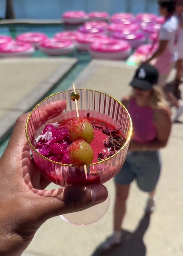 person holding a cocktail in a gold-rimmed glass. The drink is pink with what appears to be shredded purple cabbage and two grapes on a skewer as garnish. In the background is a sunny outdoor setting with a pool filled with pink donut-shaped floats. People are standing and walking around the pool area. The day is bright with a clear blue sky. A fountain is visible in the pool.